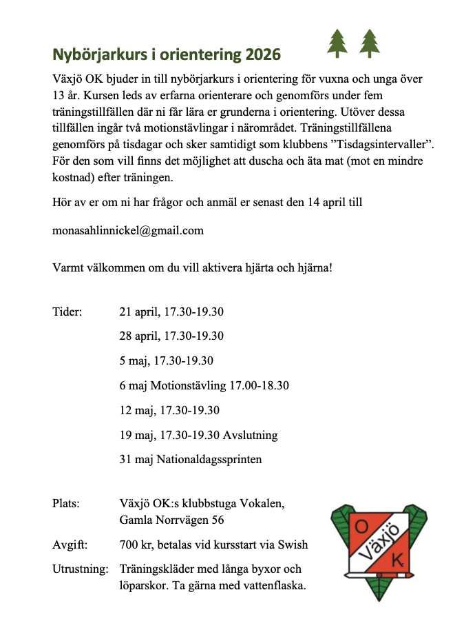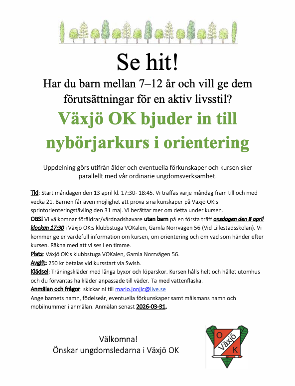 Växjö OK erbjuder varje år en nybörjarkurs för barn/ungdomar. Nybörjarkursen brukar starta i mars eller april. Det är ett bra sätt att lära sig grunderna inom orientering innan man kommer med i den ordinarie verksamheten. I mån av tillgång på ledare och möjligheten att genomföra ett bra mottagande så tar vi emot nya barn löpande under året.